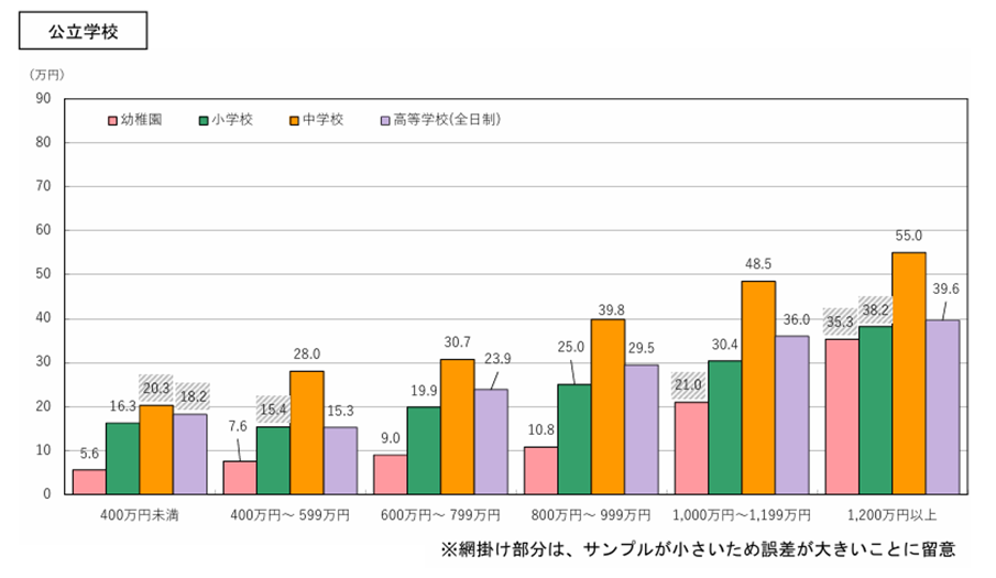 公立・私立ともに、世帯年収が多いほど、習い事にかける費用も多くなることがわかります。年収1,200万円以上の世帯を見ると、前述の平均額を大きく上回っています。
