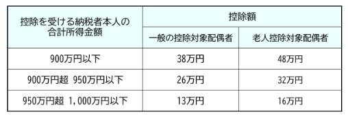 控除額は、控除を受ける納税者本人の合計所得金額、控除対象配偶者の年齢に応じた金額となります。