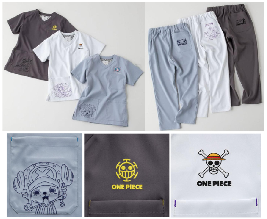 子どもから大人まで人気があるワンピースとコラボしたコレクションでは、医療と親和性のあるキャラクターが起用されたスクラブが販売されています。