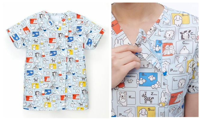 個性豊かなキャラクターが散りばめられたスクラブは、子どもの目を引き、診察や治療への不安な気持ちを紛らわせてくれそうです。