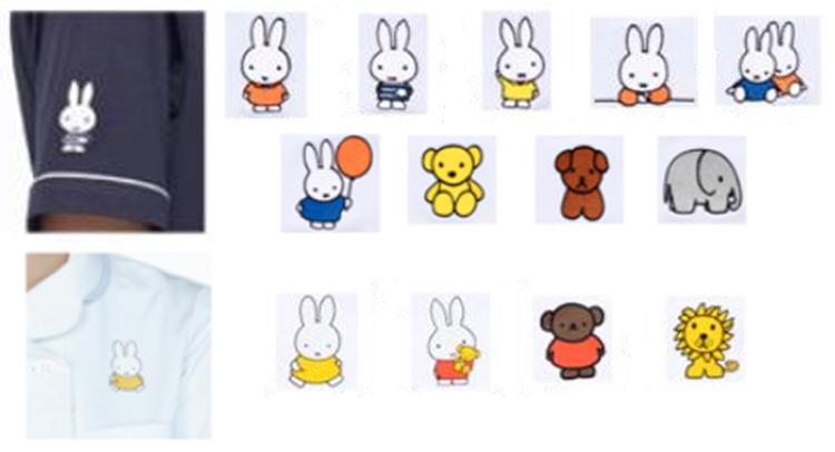 全面のプリント柄は派手すぎる…という方には、白衣の胸元や袖にミッフィーたちの刺繍やプリントを入れられるサービスもあります。ワンポイントでさりげなくミッフィーを取り入れてみるのもいいですね。